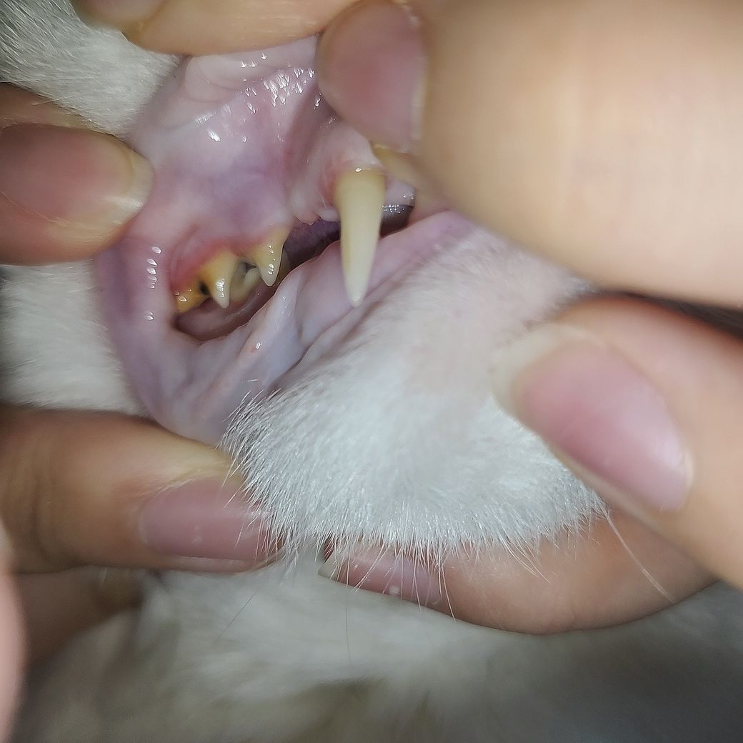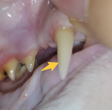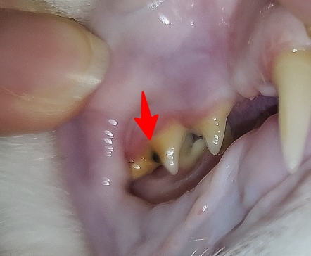 빨간색 화살표를 말하는것이라면 음식물 찌꺼기의 부패상황 혹은 충치 양상과 유사합니다. 또한 주변부로 치석과 치태가 심하니 동물병원에 데려가서 치과 진료를 받아 보시는걸 추천합니다.