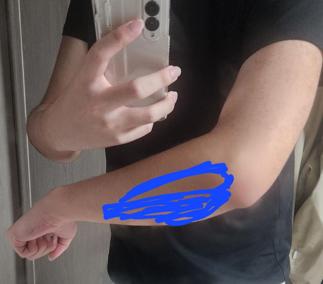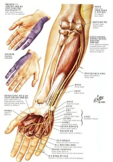 말씀주신 것처럼 사진과 설명을 종합하면 한 가지 신경 압박성 질환 가능성이 비교적 높습니다. 특히 표시하신 부위와 증상 분포를 보면 주관절 부위 척골신경 압박, 즉 주관터널증후군과 상당히 유사한 양상입니다. (잘 찾아보셨습니다.)