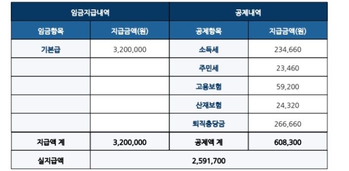 현재 계약직으로 근무 중이며 세전 월급 320(2대보험-산재, 고용, 퇴직금 포함)으로 계약하고 입사하였습니다. 그런데 월급 명세서를 보니 소득세 등이 과하게 공제되는 것 같아 맞는지 문의드리고자 합니다.
