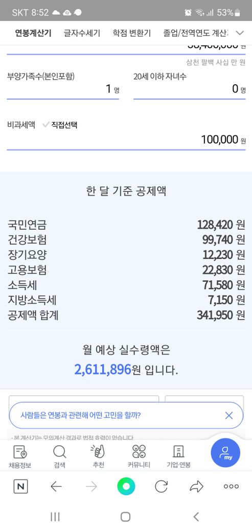 아래는 네이버 세전세후 계산기로 세전 320, 퇴직금포함, 4대보험(2대보험이 없더라구요..) 대강 계산해본 내역입니다