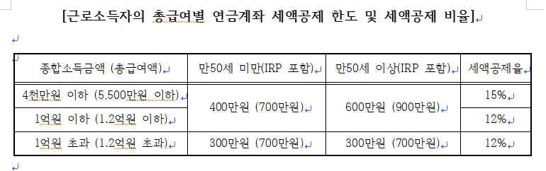 연금계좌 세액공제의 한도와 세액공제율은 아래와 같습니다.