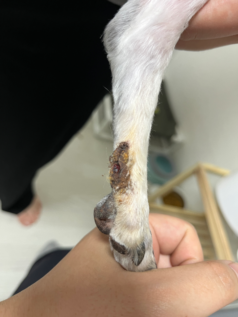 다만 사진상으로 보이는 병변은 오염이 심하게 일어나고 있는 상태로 생각되니 동물병원에 데려가서 소독 및 봉합수술을 받으시기 바랍니다.