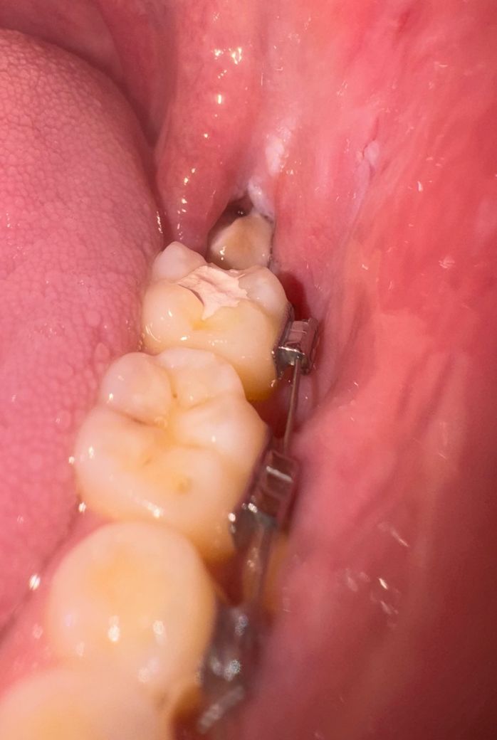 사랑니 발치한곳에 음식물이 들어가 잇는 상태 같습니다. 치과에 가셔서 소독을 한번 받아보시는게 좋을것같습니다.