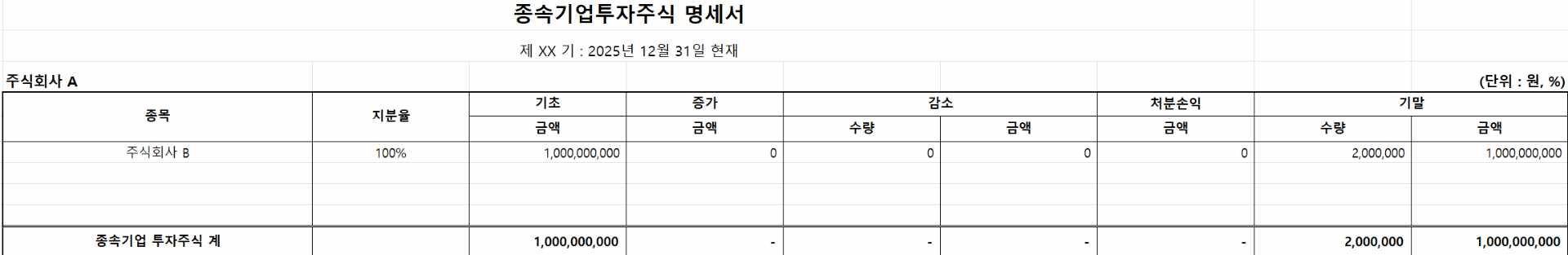 A사 입장에서 B사 지분은 종속기업투자주식명세서(혹은 연결대상이 아닌 경우 매도가능증권으로 표시하기도 함)으로 표시하며 지분율을 표시합니다.