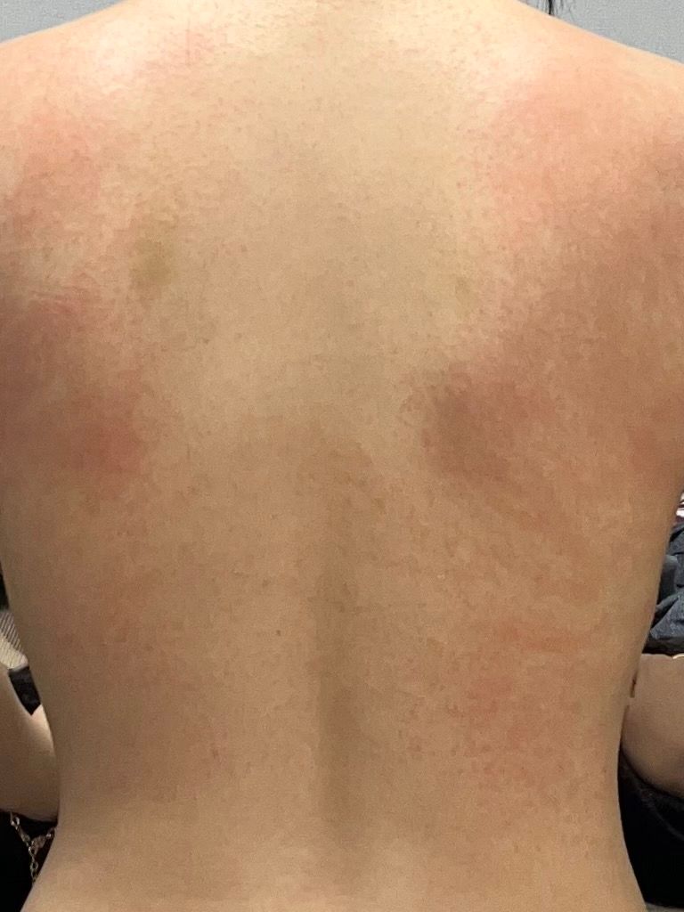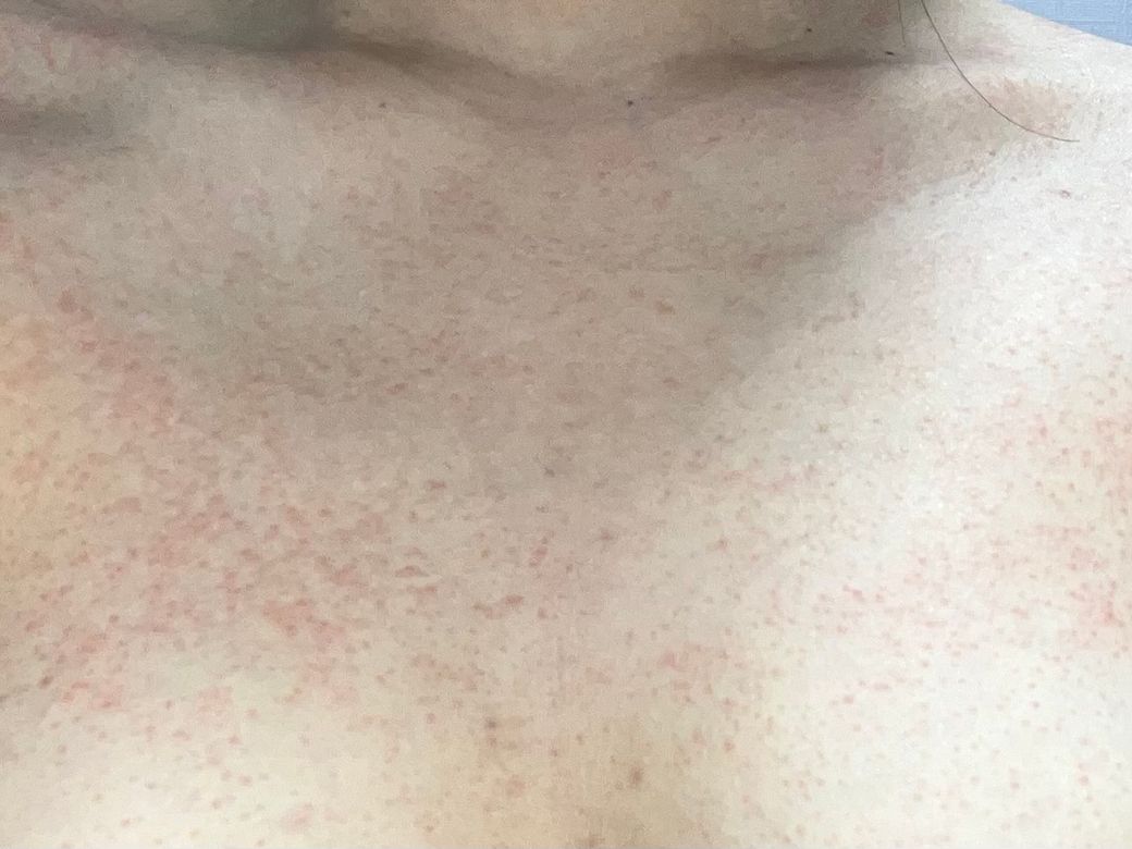저녁경에 잔뇨감과 몸에 열감이 엄청 올라오더니 새벽경에 팔부터 간지럽기 시작하며 가슴과 등으로 빠르게 번졌습니다. 열감과 간지러움 동반이에요.