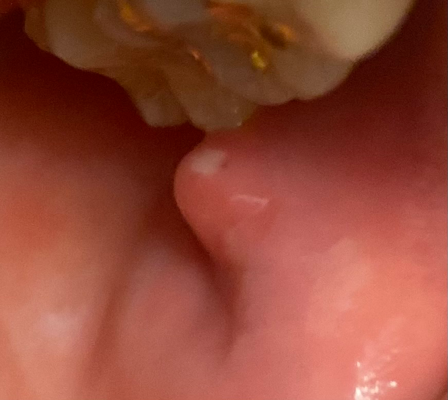 점막 쪽에 궤양 병변도 관찰되는 것으로 보아 구내염 등의 염증성 병변 또는 종양의 가능성 까지 다양한 진단이 가능합니다.
