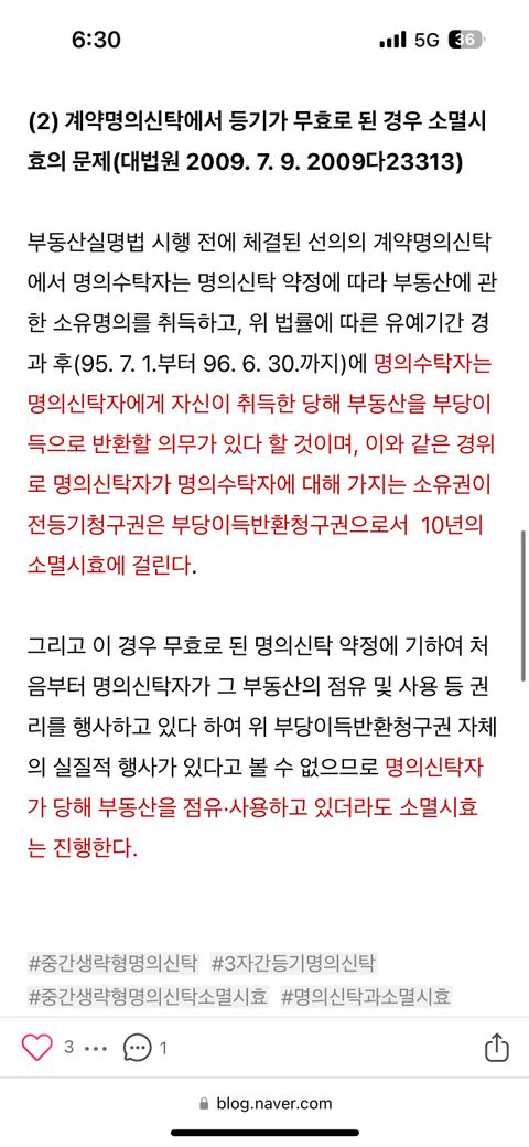 명의신탁에 의한 등기가 무효로 됐을때 매수인(신탁자)가 부동산을 계속 점유중이라면 소유권이전등기청구권의 소멸시효는 진행하는지 중단되는지 여부