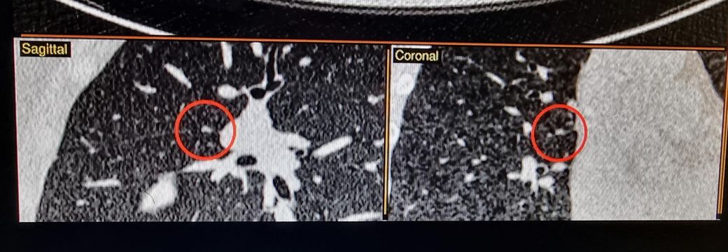 CT에서 환자분이 말씀하신 것처럼 작은 결절은 한 커트만으로는 알 수 없고 여러 커트를 봐야 합니다.