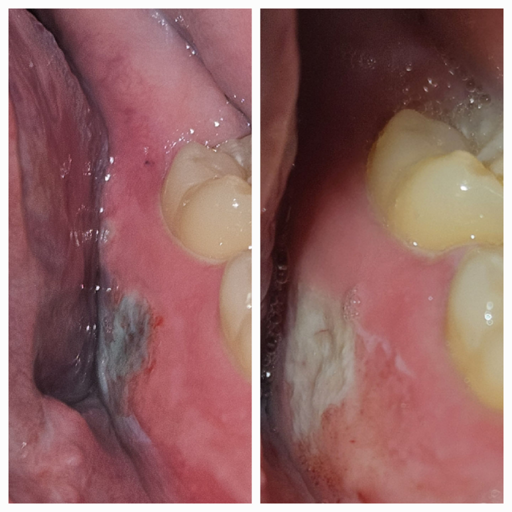 2. 사진상으로는 더 심해지고 있는 상태로는 보이지 않고, 처음의 상태도 일반적인 구내염으로 보이지는 않는데 치과에서 진단이 필요해보입니다.