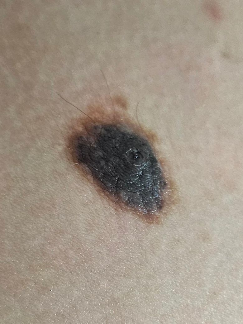 사진상 병변은 경계가 비교적 뚜렷하고, 전체적으로 균일한 매우 짙은 색조를 가지며 표면이 거칠고 약간 돌출된 형태로 보입니다. 말씀하신 것처럼 오래전부터 존재해온 점이라는 점은 양성 병변 가능성을 시사하는 요소입니다. 특히 색이 매우 진하지만 비교적 균일하고, 타원형으로 대칭성이 어느 정도 유지되는 점은 전형적인 악성 흑색종의 소견과는 일부 차이가 있습니다.