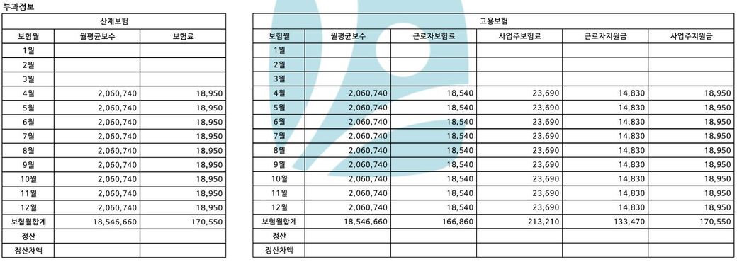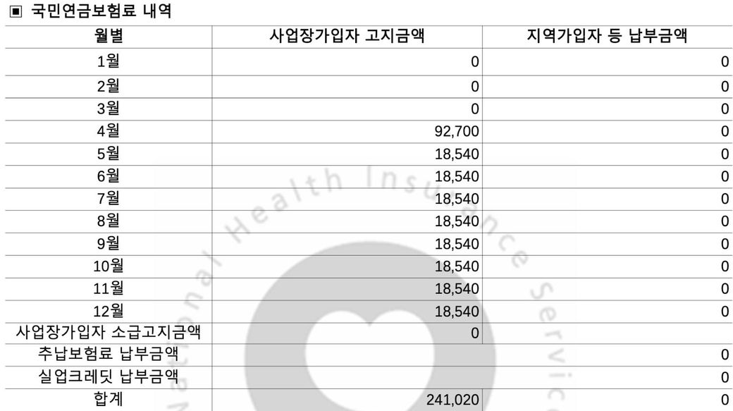 국민연금 납부 확인서 : 4월부터 납입, 건보료 : 4월부터 납입, 고용보험 산재보험 : 4월부터 납입