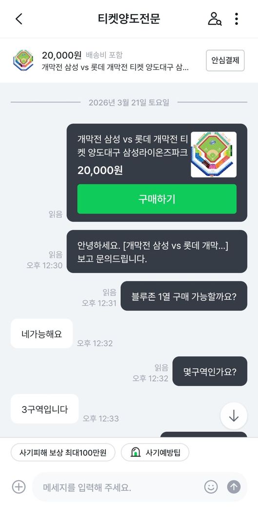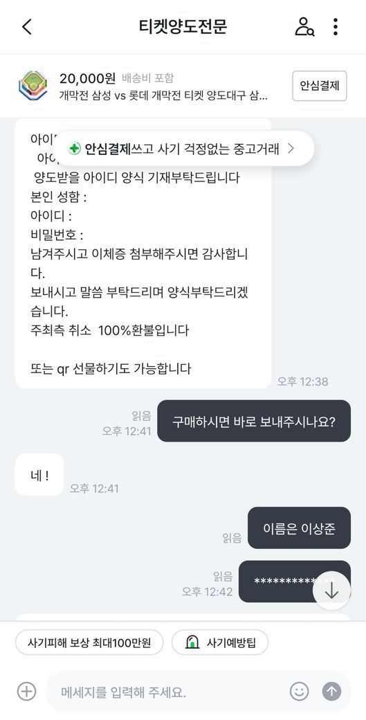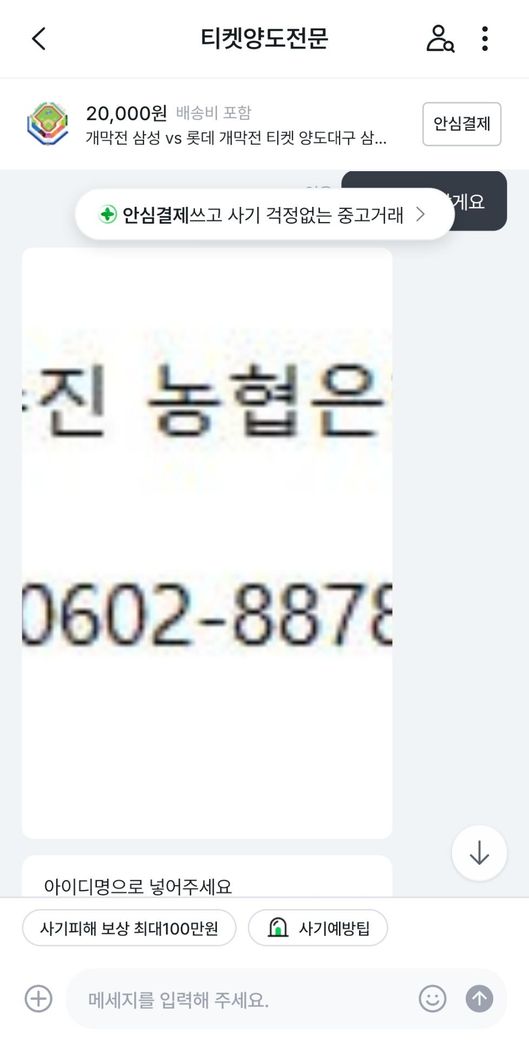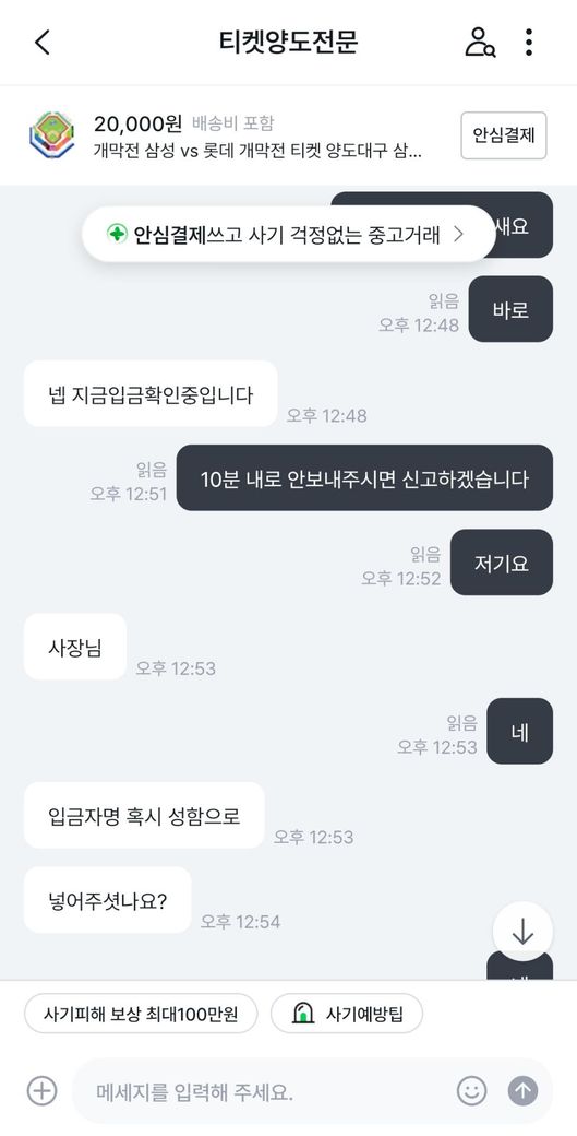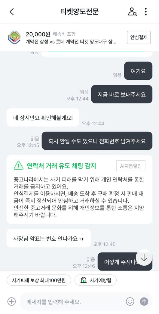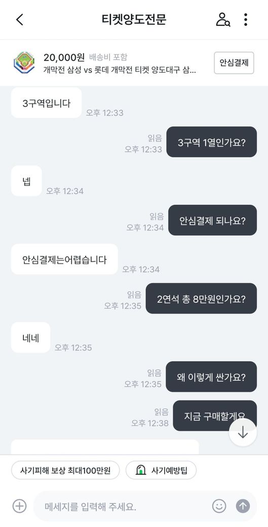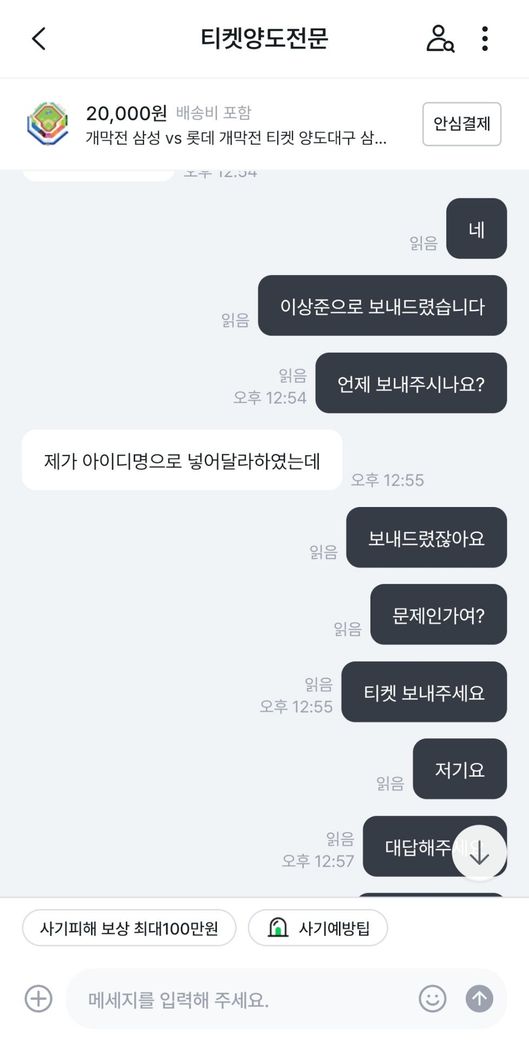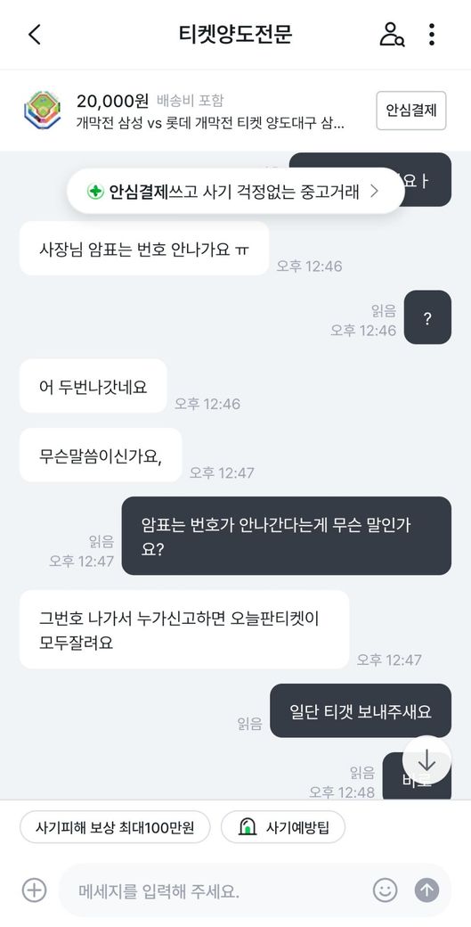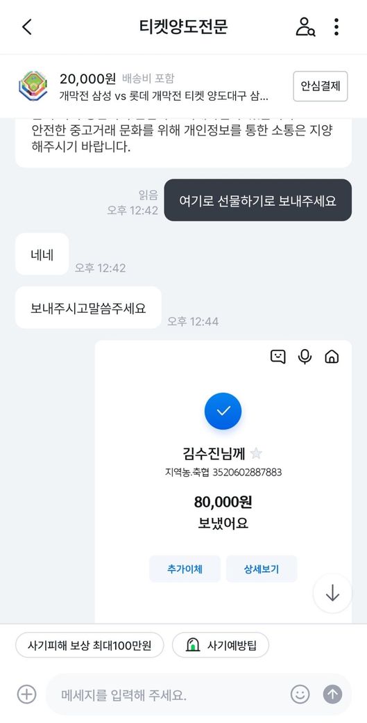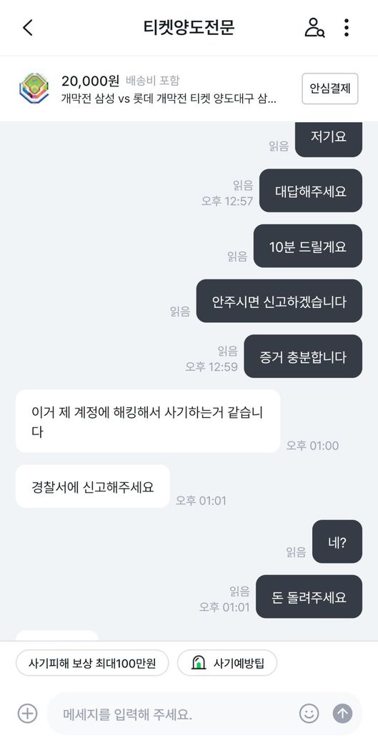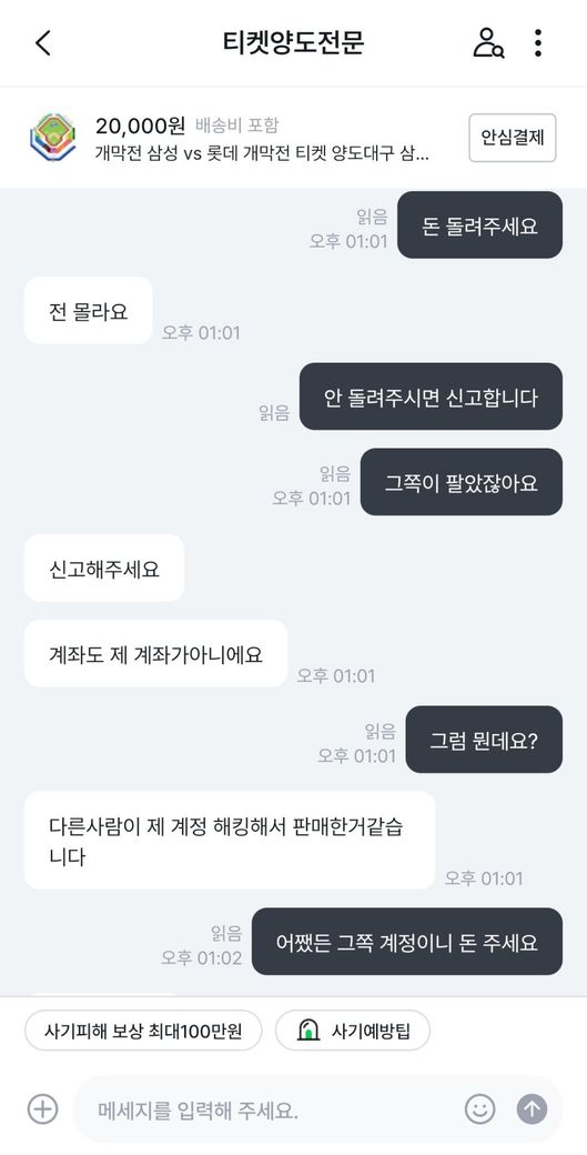 삼성라이온즈vs롯데자이언츠 프로야구 개막전 티켓을 중고나라에서 알아보던 중 마음에 드는 좌석을 발견해서 판매글에 구매 문의를 남겼습니다.구매가 가능하다고 해서 계좌로 보내달라고 해서 계좌이체 후 티켓을 달라고 하였습니다.그런데 티켓을 보내주지 않고 있어서 왜 보내주지않느냐하고 물어보았습니다.판매자는 제 계정에 해킹하여 사기하는 것 같다고 하면서 티켓을 못 보내주겠다고 하였습니다.그래서 저는 환불을 해달라 8만원 보내달라고 말하였는데 판매자는 돈이 없다라고 하면서 못보내주겠다고 하였습니다.그래서 더치트에 사기글을 올렸고 신고 접수는 다음주 월요일에 경찰서에 가서 할 예정입니다. 제 이야기를 보시고 사기가 맞는지 사기가 맞으면 돈 돌려 받을 수 있는지 궁금합니다
