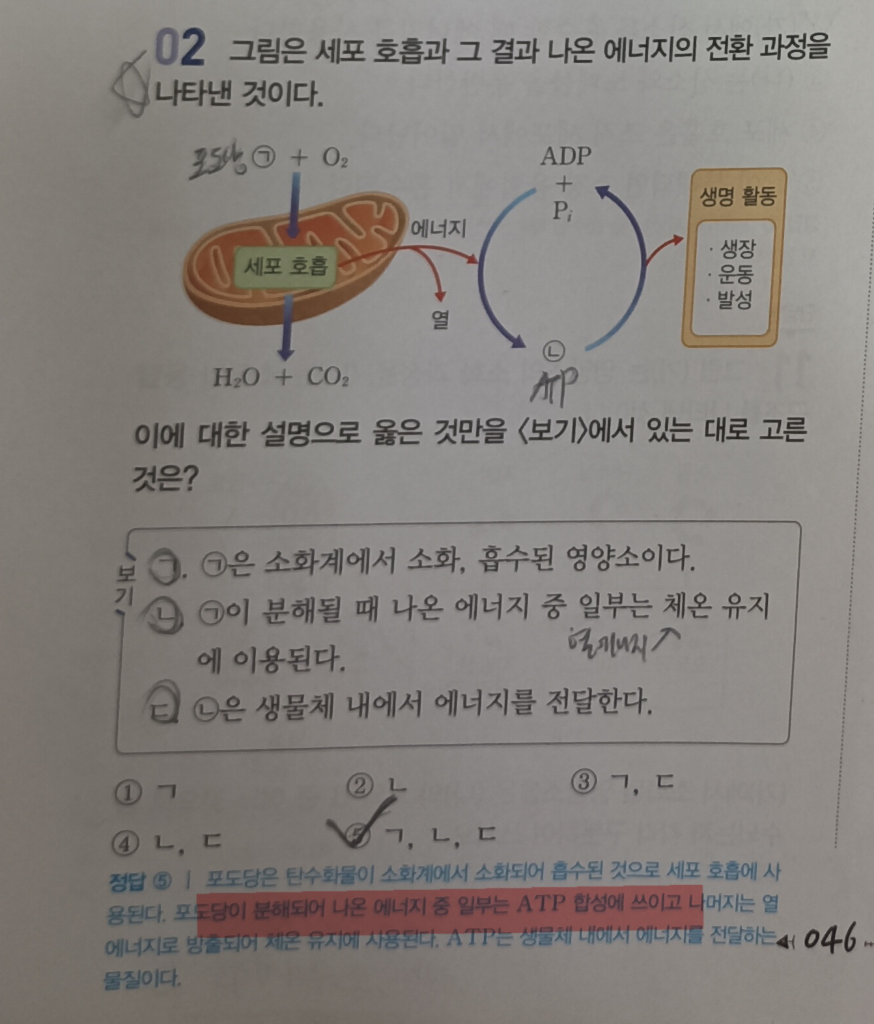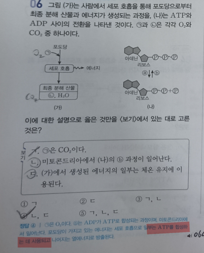 "미토콘드리아 안에서의 세포 호흡 과정에서 방출되는 에너지 중 일부는 ADP가 ATP로 다시 합성되는데 쓰인다" 라는 걸 알 수 있습니다.