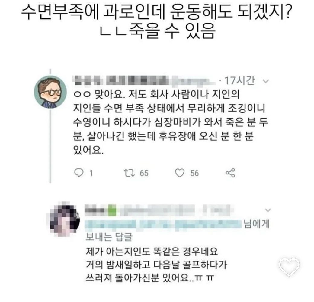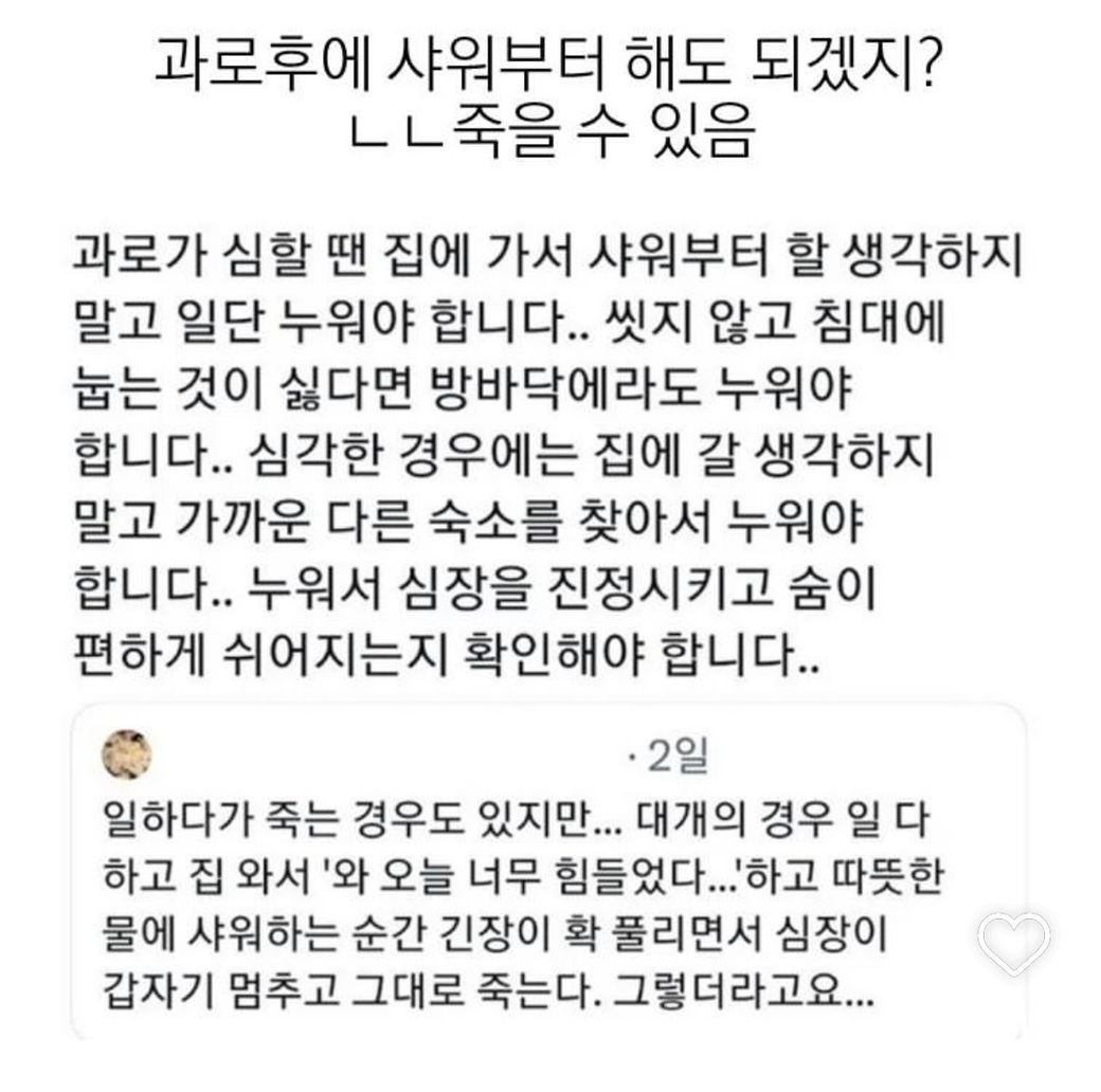 그러나 수면부족 상태에서 운동을 하거나 샤워를 한다고 해서 사망에 이른다는 결론을 내리는 것은 무리한 주장입니다.