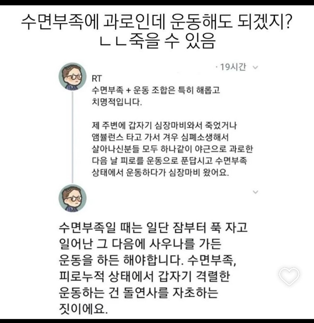 일상적으로 7, 8시간을 자도 피로가 풀리지 않는다면 그 자체가 이미 수면의 질이 낮을 가능성이 크며, 그런 상태에서 격한 운동을 피하는 것이 좋습니다. 또한, 4시간 정도 잔 날 이후 충분한 수면을 취해도 여전히 피로감을 느낀다면 역시 과도한 활동을 삼가는 것이 바람직합니다. 일반적인 운동이나 일상 활동은 괜찮을 수 있지만, 격렬한 운동은 주의해야 합니다.
