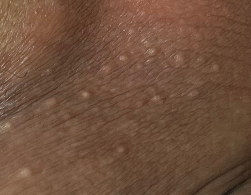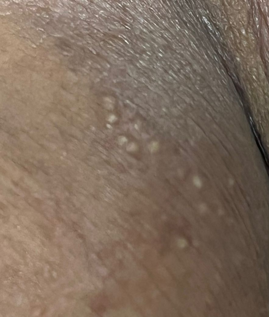 성기 유두종이나 피부융기증과 같은 피부 병변의 가능성이 먼저 의심됩니다.