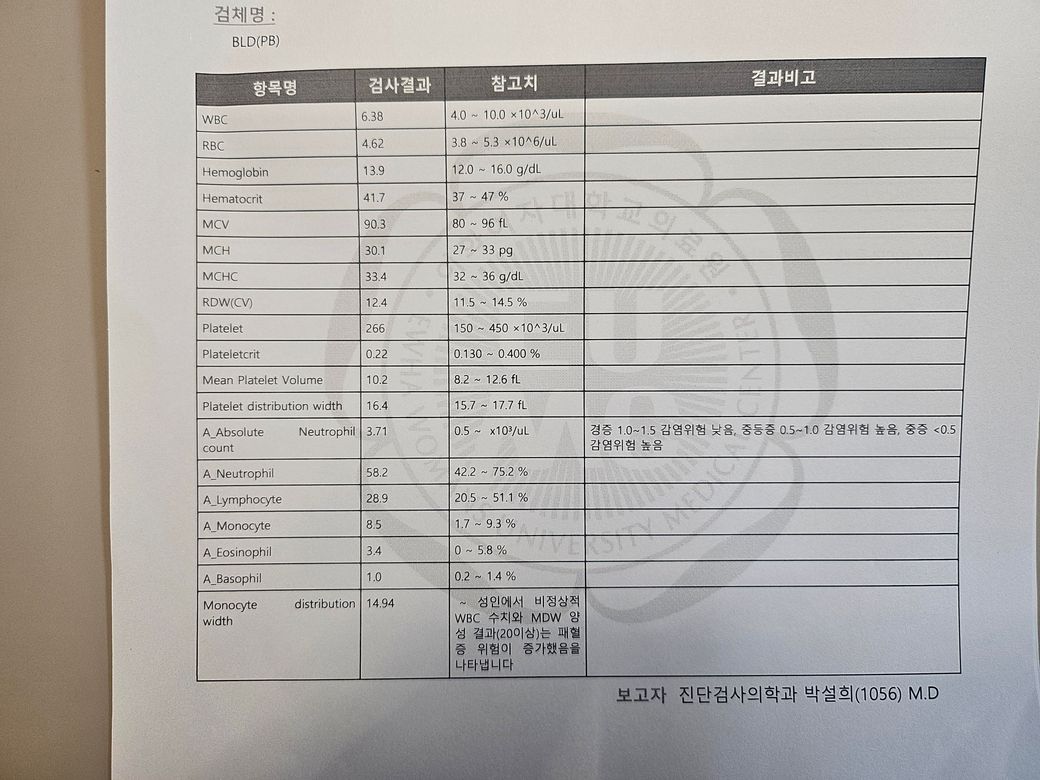 호중구수가 500개 이하라면 면역저하로 판단하여 격리를 고려해야겠습니다. (질문자분은 3700 개 정도이니까 아주 정상입니다)