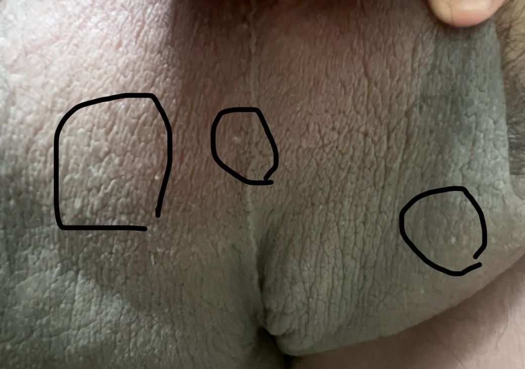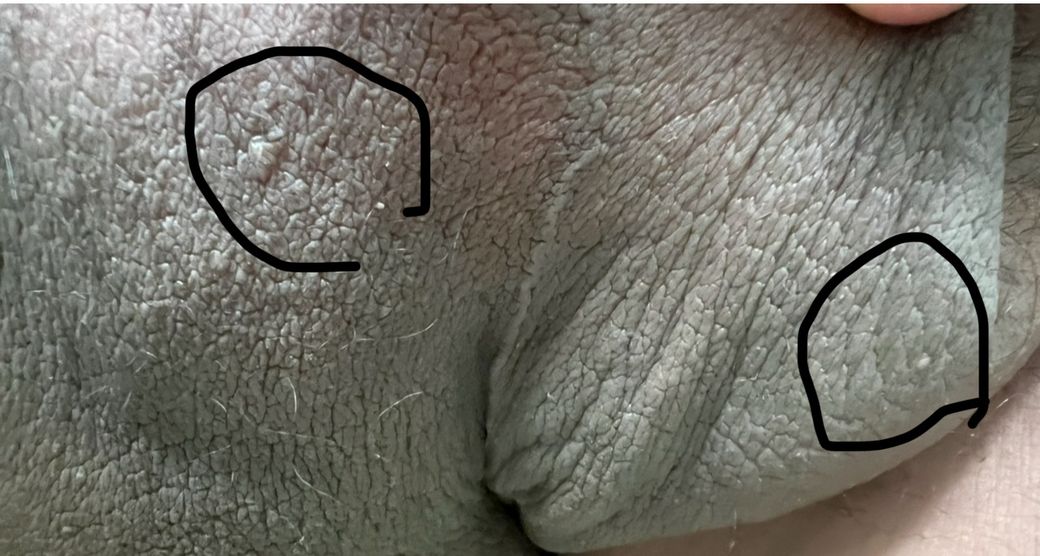 고환이 좀 가렵고 보니까 저렇게 뭐가 난거 같기도 하고 한데 혹시 저렇게 동그라미 쳐놓은 부분들이 헤르페스 2형 성병 병변일까요? 혹시 아니라면 뭐때문에 저렇게 생긴게 올라온걸까요 궁금해서 여쭤 봅니다 제가 병원을 못가는 상황이라 이렇게 질문 드려요 답변 해주시면 감사하겠습니다 ㅜㅜ