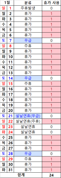 1. 2023년 1월 총 31일 중 무급휴일인 토요일(7, 14, 21, 28일)과 유급휴일인 설날연휴(1일, 23, 24일)를 제외한 24일을 차감하여 정산합니다.(예시 표 이미지를 첨부했습니다.)