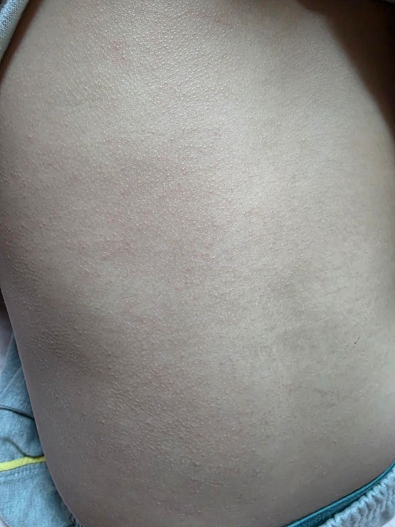 사진과 설명을 종합하면, 현재로서는 큰 피부병 가능성은 낮아 보입니다. 가장 흔하게는 건성 피부에 동반된 모낭각화증(닭살 피부) 또는 땀·마찰과 관련된 경미한 땀띠/자극성 발진 양상이 의심됩니다. 아이들에서 등, 가슴, 배에 좁쌀처럼 오돌토돌 만져지고 붉은기 없이 피부가 거칠어 보이는 경우가 매우 흔합니다.