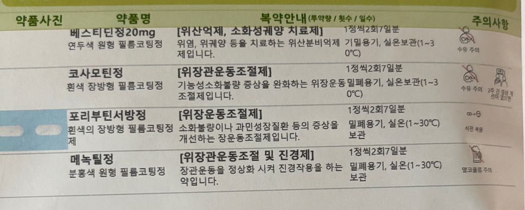 속쓰림 증상으로 베스티딘정20mg,코사모틴정,포리부틴서방정, 메녹틸정을 처방받았습니다.