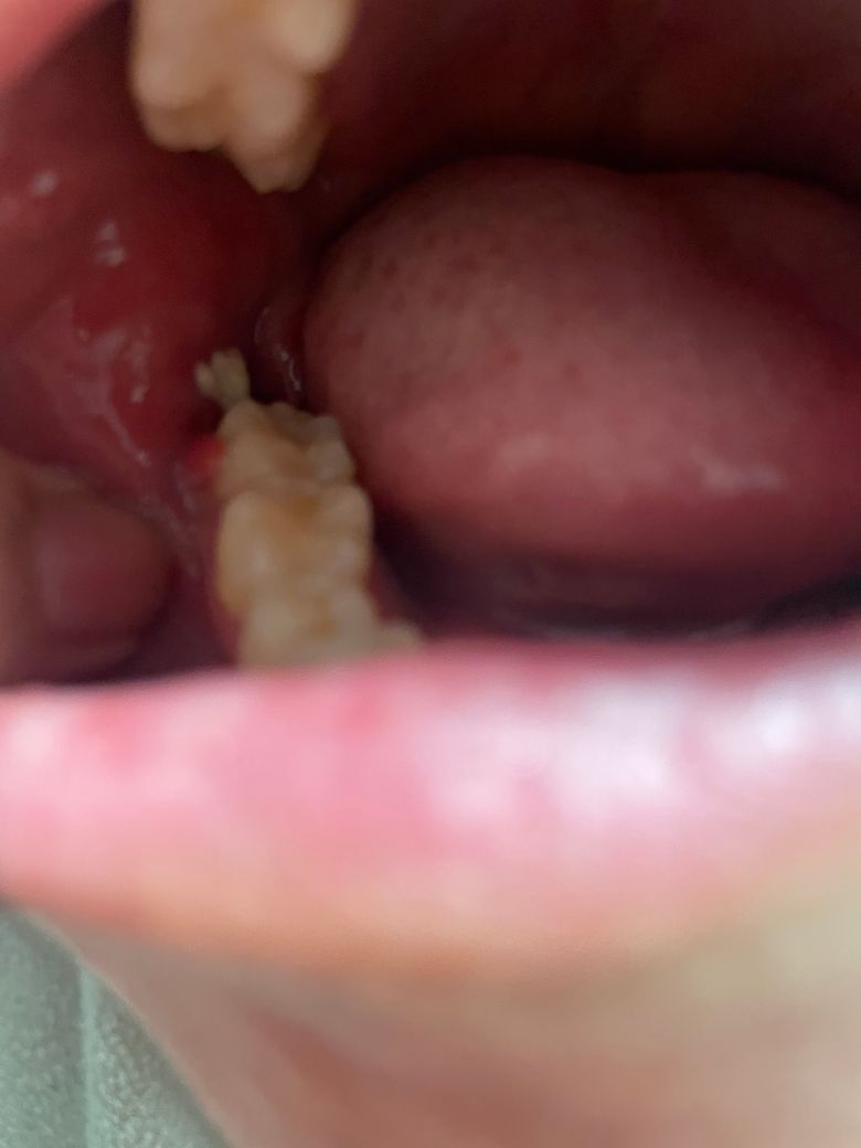 사랑니 뽑은지 2주가 되어가는데요. 사진 속 하얀 말랑한게 가글하면 튀어나옵니다. 근데 떨어지진 않고 끝에 조금 붙어있어서 더 건드리진 않았어요. 냅두면 사랑니 뽑고 난 구멍 안쪽으로 쏙 들어가더라구요. 떨어지지 않는거 보면 음식물은 아니고 낫고 있는 과정 인건가요? 그리고 앞에 빨간 살? 같은 것도 이상있는 건 아닌지 궁금합니다