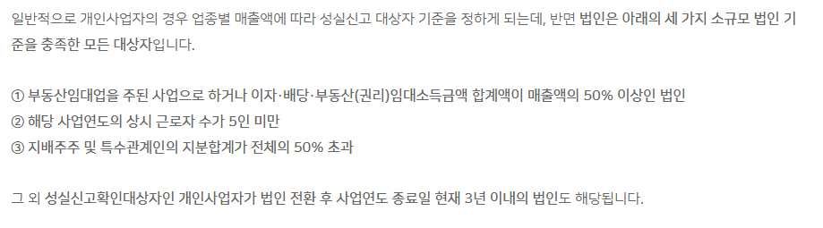다만, 성실신고확인대상인 개인사업자가 법인 전환 후 사업연도 종료일 현재 3년 이내의 법인 (’18.2.13.이후 법인 전환 분부터 적용인 법인은 무조건 성실법인에 해당하는 것입니다.