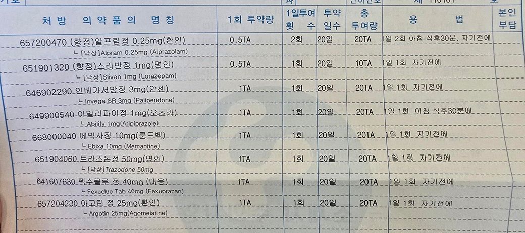 현재 저희 어머니께서 대학병원 노인정신건강학과에 내원하시어 드시고 계신 약입니다.