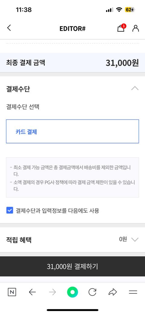 1. 카드 종류 확인 – 에디터샵은 간혹 법인카드나 체크카드를 지원하지 않는 경우가 있어요. 신용카드(개인)로 시도해보세요.