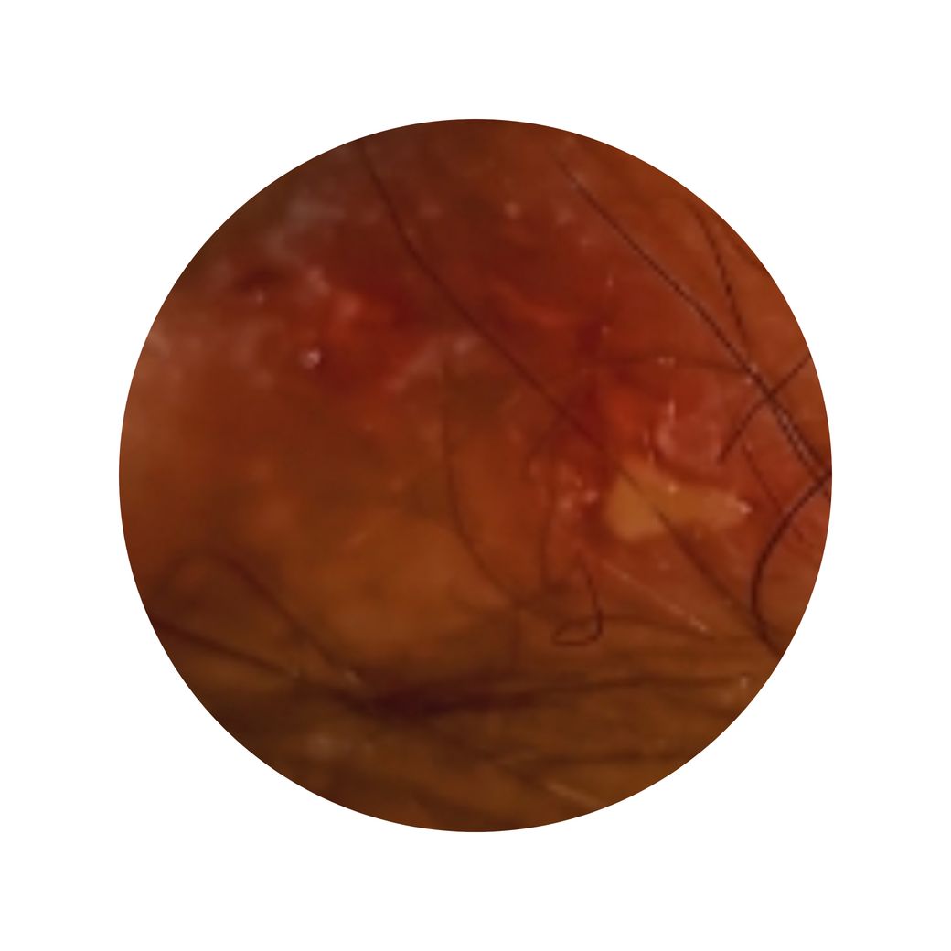 약간의 궤양성 점막 병변이 생기신 것 같습니다. 깨끗히 소독을 한뒤 최대한 추가자극이 없게 두는 것이 좋을 것으로 판단되며 땀띠 분은 안바르시는 것이 좋겠습니다.