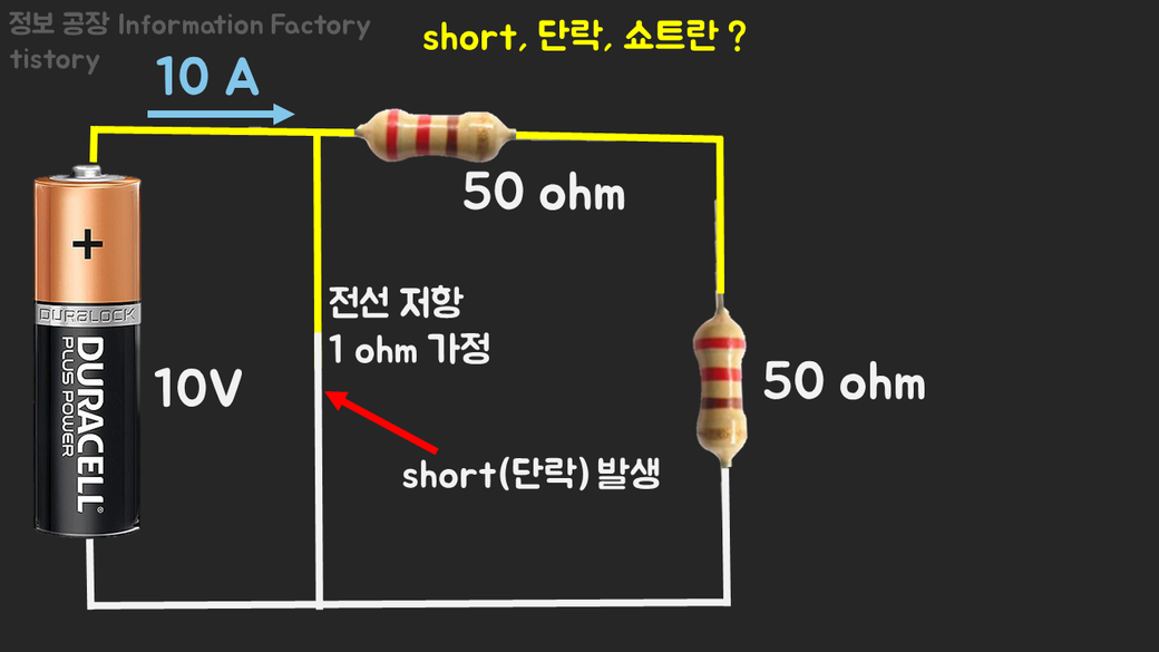 저 그림대로면 0.1a 의 전류가 흐르다가 쇼트가 나버리면 10A의 전류가 흘러서 100배가 되어버린다고 하는데