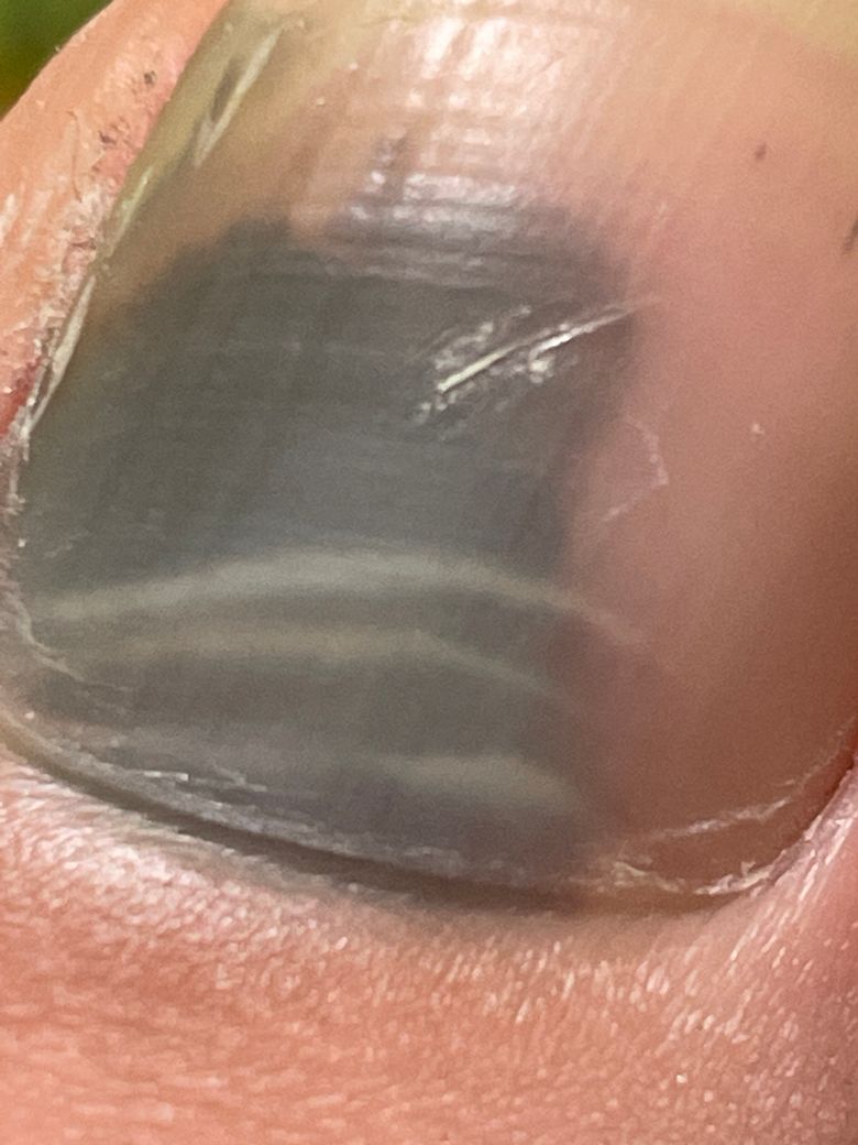 조갑하 혈종, 손톱 밑 혈종이라고 하여 손발톱 아래 피가 고이는 현상입니다. 시간이 지나면 호전되므로, 통증 등의 증상이 발생하는 것이 아니라면 지켜볼 수 있겠습니다.