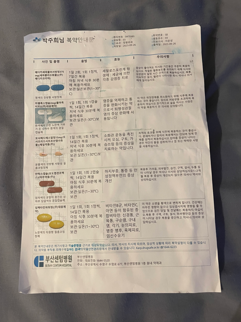 그래서 오늘부터는 원래 항생제 없는 약을 그냥 평소대로 먹으면 되는데 제가 실수로 또 약을 바닥에 떨어트려버려서 오늘 약이 없는 상황이에요