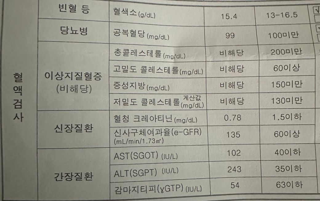 검진 결과를 보면 ALT(SGPT) 수치가 243로 정상 범위인 350 이하보다는 낮지만 상당히 높게 나타났습니다. 이는 간 손상이나 염증이 있을 가능성을 시사합니다. AST(SGOT) 수치는 102로 정상 범위 내에 있으며, 감마지티피(γGTP) 수치도 54로 정상 범위 내에 있습니다. 이러한 수치는 간 손상이나 염증을 나타낼 수 있으며, 이는 비알콜성 지방간 질환(NAFLD)이나 간염 등 다양한 간 질환과 관련이 있을 수 있습니다.