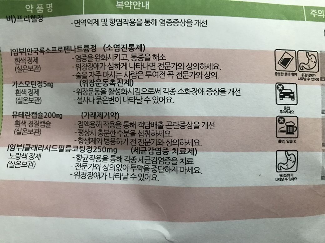 질문하신 내용에 대하여 아래와 같이 답변 드립니다.처방받으신 약중에 소염진통제가 있는것으로 확인됩니다.