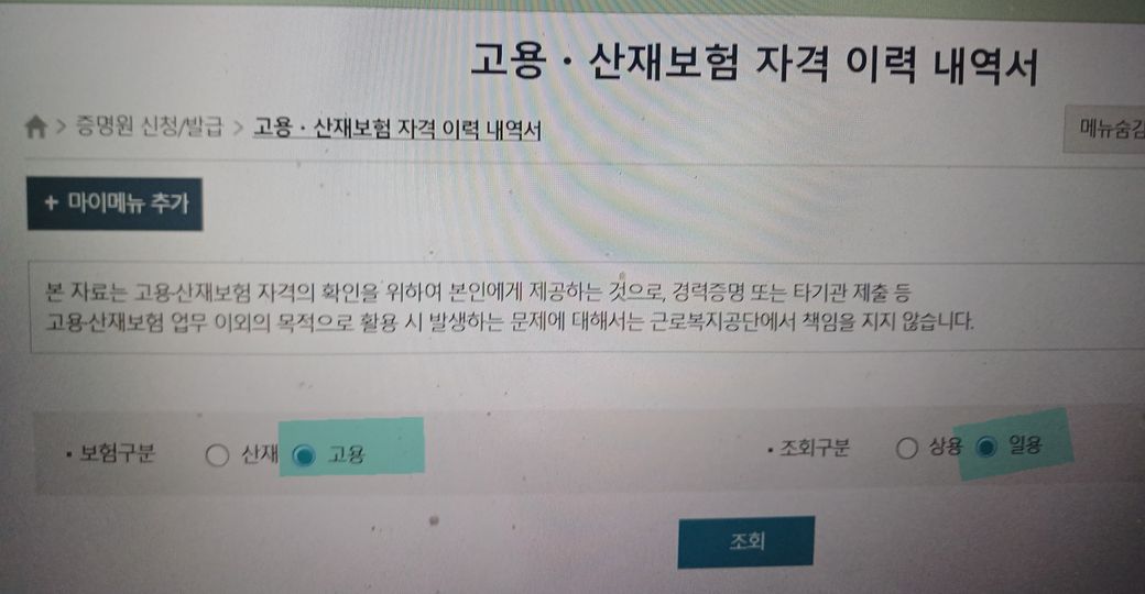 현재 투잡으로 알바하는곳이 고용보험에 가입된줄 몰랐는데 조회사이트에 들어가서 보험구분 고용으로 선택하고 조회구분을 일용으로 하니까