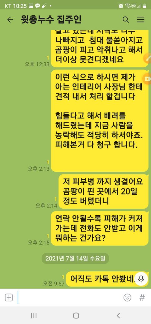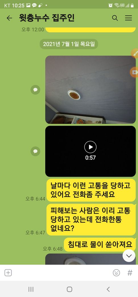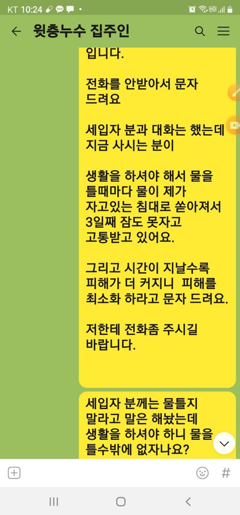 윗층집주인 이란분이 전화통화와 문자 카카오톡으로 아무리 연락을 취해도 아무런 답변도 없었고 물이 계속 쏟아 지는데 세입자가 이사갈때까지 방치해 두었습니다.