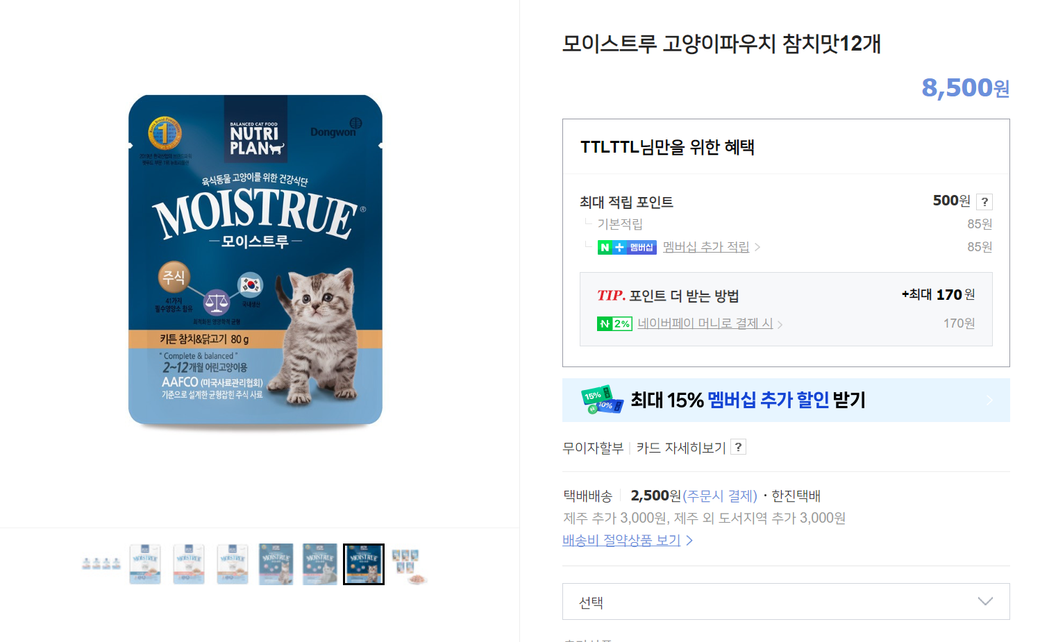 어제 밤에는 모이스트루 키튼 참치&닭고기 80g 조금과 원래먹던 로얄캐닌 키튼 건식 사료를 섞어서 주고 잤습니다.