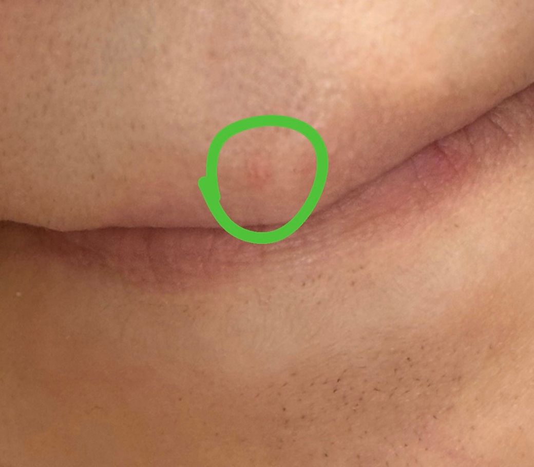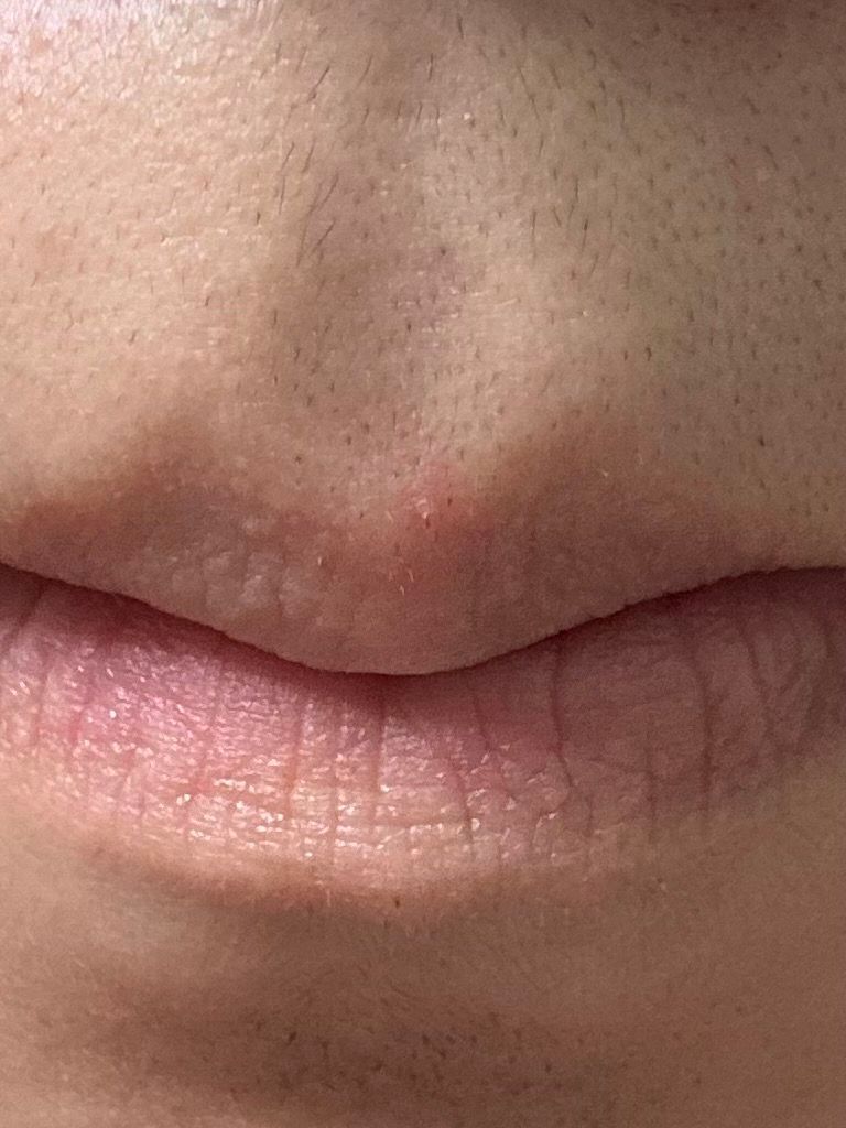 입술에 뭐가 났습니다. 사진에 잘 담기는지는 모르겠지 만 엄청 작고 가운데 살짝 하얗게 고름? 같은게 있는데 그냥 뾰루지인가요? 수포같이 투명한 느낌은 아니에요