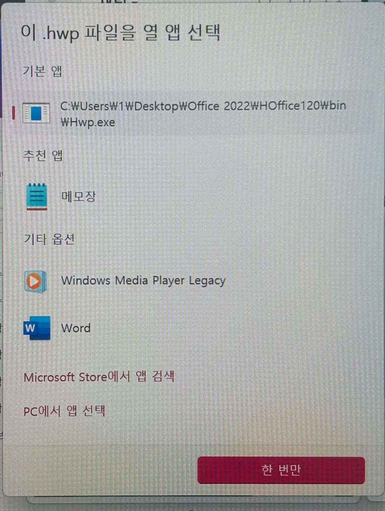 항상 이앱을 사용하여 HWP 파일열기 옵션 체크후 확인