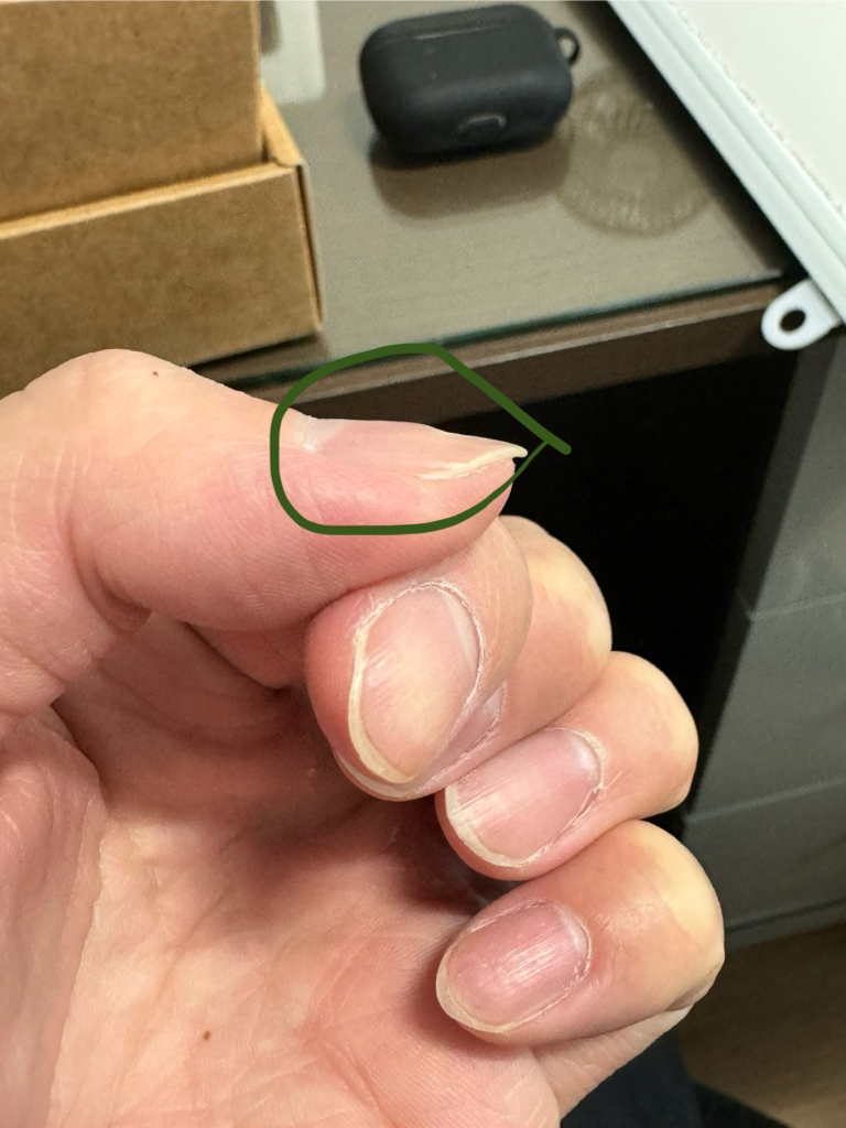 조갑이영양증이 생긴 상태입니다. 평소 손톱에 자극을 많이 주는 경우에도 생기고, 무좀균이 감염되어도 생길 수가 있습니다. 정확한 원인을 알아야 치료가 가능하니 피부과로 가보시기 바랍니다.