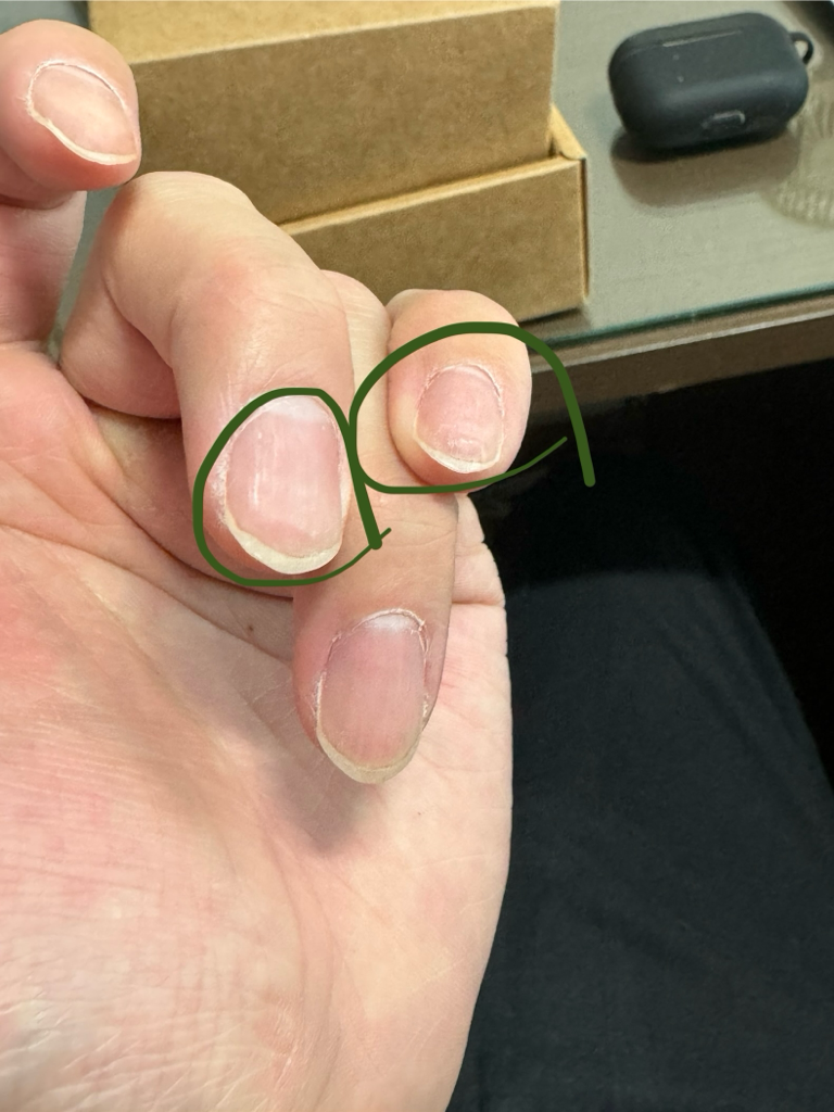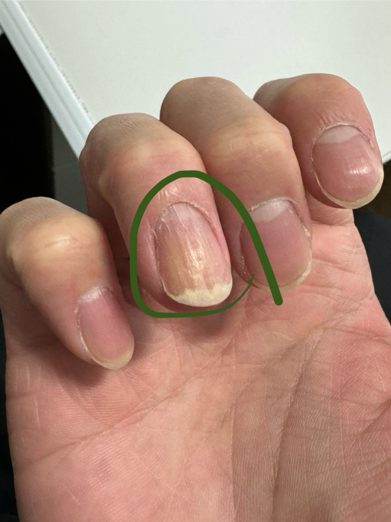 손톱이형성증이 나타나는 상황으로 보입니다. 열손가락, 열발가락 모두 영향을 받는 경우 스무손발톱이형성증이라 부르는데, 이러한 질환으로 이어질 여지도 있습니다. 피부과에서 진료를 받아보시기 바랍니다.