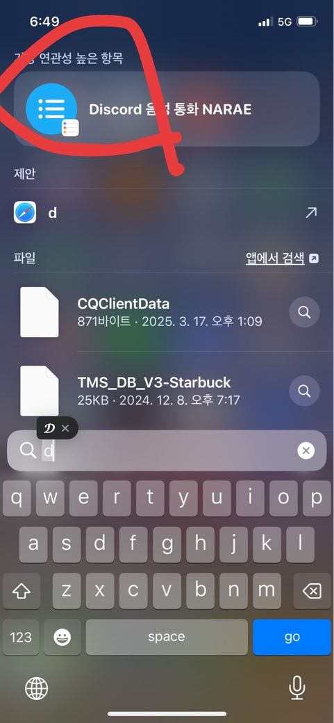 이제 한번 설정 바꾸시고 나서 스포트라이트 검색창 다시 열어보시면 디스코드 기록 깔끔하게 정리되었을 겁니당
