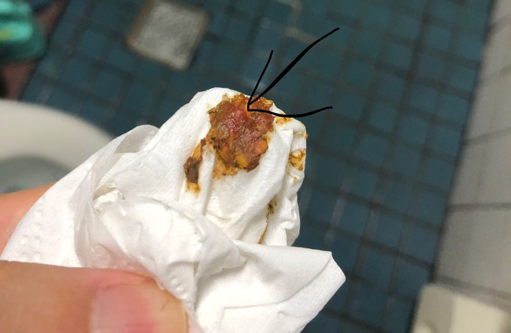 오늘 오전에 대변을 본 뒤 2시경에 대변을 한번 더 보았습니다. 조그마한 대변들이 나왔는데 변의 윗부분이 붉은거 같아(아래 첫번째 사진), 휴지에 두고 안쪽을 헤쳐보았습니다. 2번째 사진과 같은 붉은 부분이 보이는데 음식물인지 혈변인지 궁금합니다.