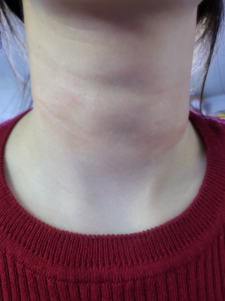 습진과 같은 피부질환의 가능성이 생각됩니다. 피부과 진료를 권하며 갑상선 비대가 가능성이 의심되므로 갑상선 초음파 검사를 고려해보시기 바랍니다.