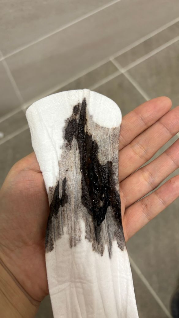 오늘 오후에 하고 있던 팬티라이너가 이렇게 되었어요 거의 검은색으로 보이고 닦으면 묻어나오는 것은 짙은 갈색이에요 무슨 문제일까요?