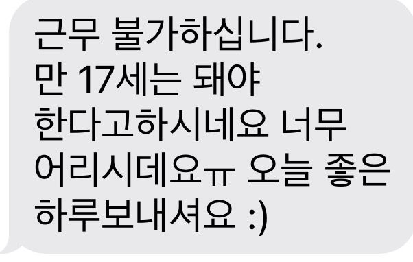 안녕하세요. 재가 행사운영스텝에 지원을 했었는데요. 만 17세가 돼야한다고하네요.라고 답장이 왔는데요. 만17세가 부터 근무가 가능 하다는 건가요. 내년에는 지원 가능한 나이가 높아질수도 있나요. 그리고 만17세도 똑같이 가족관계증명서 보호자 동의서 필요한가요