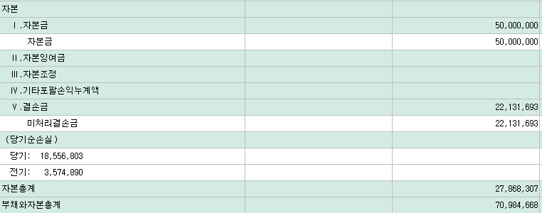 자본금 5천만원가 결손금 22,131,693원을 제외하고