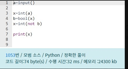 그리고 나서 C언어의 !a가 대응되는건 bool() 입니다. ! 함수는 0이면 1을 출력하고 0이 아니면 0을 출력합니다.