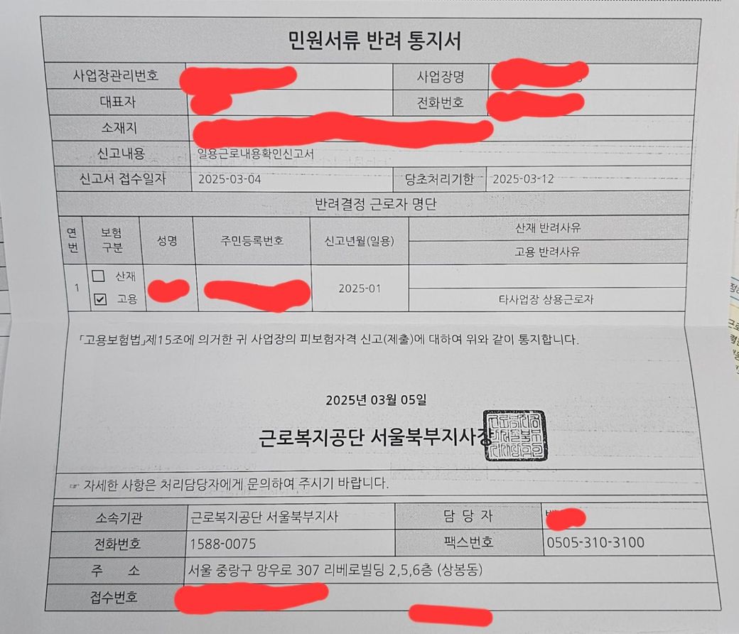 근로복지공단 민원서류 반려통지서 일용근로 질문드려요